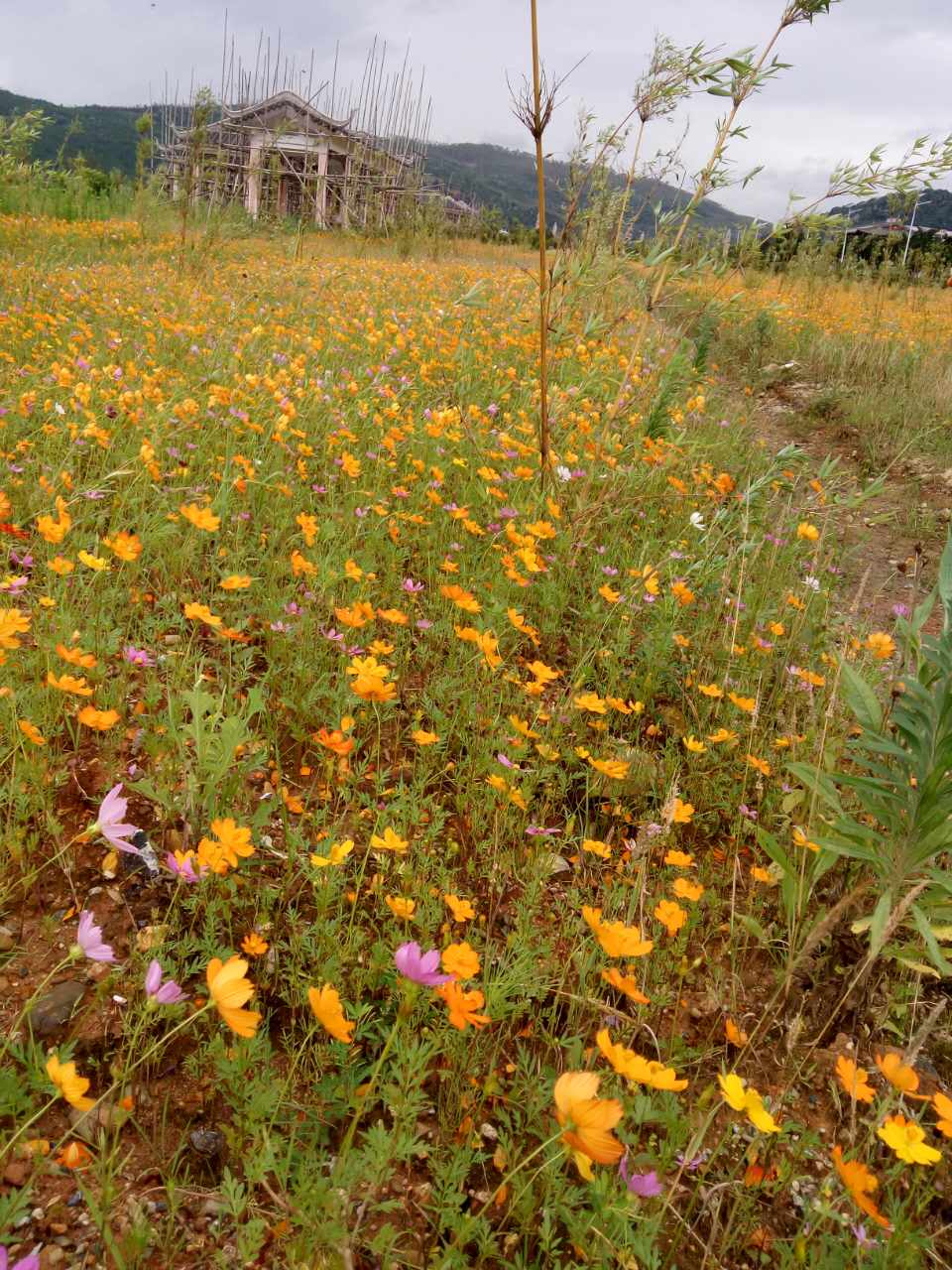 天公并不作美,乌云弥漫天际,大地被阴郁的气息笼罩着,忽刮起了风散落雨点。我拨通姐姐的手机问在哪?电话那头大声地说在花丛中,我笑了,她们没有改变行程,糟糕的天气遮不住大自然的魅力,更阻挡不了我们向往大自然的心境。晚上收到姐姐发过来的一堆照片,美不胜收,着实没想到那附近竟有如此童话般迷人的景致,遗憾没有一道前行,唯有欣赏着照片,也算是近距离接触了格桑花。初看第一眼还以为是野生的小菊花,叶子小小的,稀疏错落,高高挺立的植株,顶着大约有7、8片花瓣的小花,亭亭玉立,黄的、紫的、粉的、白的,一朵一朵,一片一片,放眼望去宛若花海。我亦仿佛置身于花丛中,如梦如幻,时间定格在这一刻,让人忘却了世间的纷扰,忽参悟渺小的含义,不禁伸手轻轻地触动花瓣,它顺势摇晃着朴实无华的娇小身躯,是在回应它的存在。
