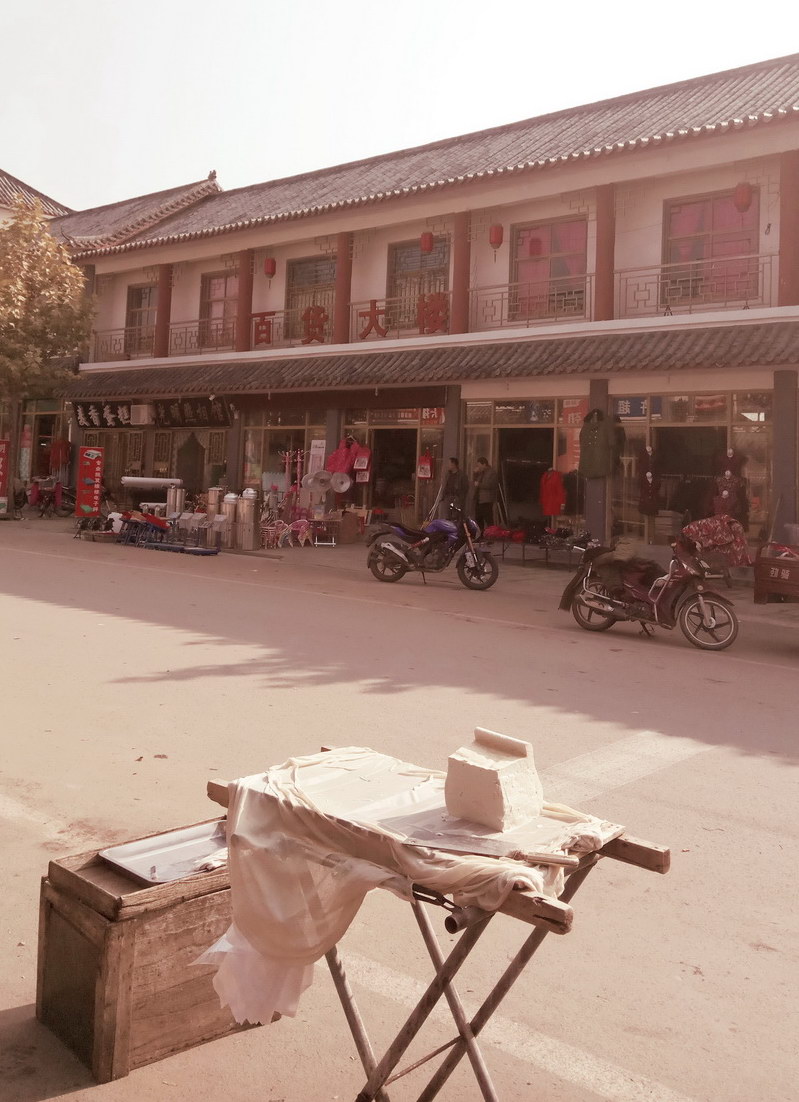 次日,阳光透过窗玻璃洒落屋内,已是早上8点了,窗外的车声由远而近,向窗外望去,路对面是一个大仓库,苹果堆满一地,诱惑的红色,好不壮观。洗濑一番后便下楼去,气温依旧很冷,见地上覆着一层雪白的霜,双臂不自觉地抱在胸前。附近仅有一家早餐店,里面设施同样破旧不堪,半米高的小四方桌,周围一圈小板凳,地上杂物随处可见,环顾四周食客,皆是上了年纪的老人,黝黑的肤色,一双粗糙的手端着碗在尽情地享用着面汤。无奈,我们也很快找了地方坐下,点了豆浆、面汤、煎饼、包子,包子特别大,面皮内裹着满满的肉馅,味道却没有独特之处,在这里找碗粥吃是相当困难的,因为没有米卖!