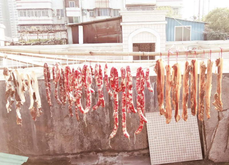 腊肠、腊肉主要的原材料为猪肉,农村自养的猪便成了抢手货,还没开始宰杀已开始接受预定,当然都是通过熟人介绍的。腊肉、腊肠确实是美味,其烹饪方式多样化,炒菜、清蒸,还可以放在火饭里焖,也就是广东常说的腊味饭,说到这都忍不住垂涎欲滴了。好吃,但腌制工艺我闲麻烦,让爸妈不要折腾了,毕竟相比过去,如今的生活变化很大,想吃就去超市买岂不方便。爸妈是给劝说下来,姐姐和姐夫却闲不得,一个做腊肠,一个做腊肉,今天腌制好一盆,隔几天又来一盆,我也前后帮忙拎到楼顶晾晒。好在天气不太糟,串在竹杆上放置楼顶风吹日晒了几天,肉质由粉红色渐渐变成暗红色,颇有模样。