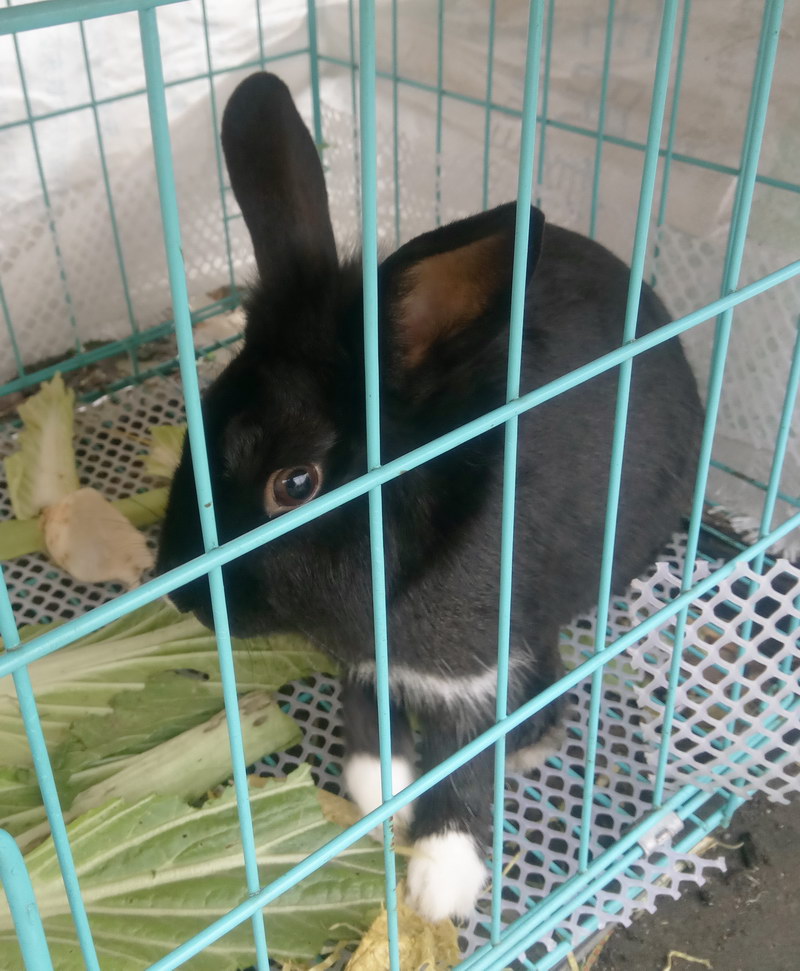小兔子是黑色的,一身泛着光泽的黝黑色绒毛着实惹人喜爱,唯见四肢前掌处裹着一团白毛,黑白分明点缀得极致,两颗玻璃球似的透亮的黑眼珠滴溜溜转着,长长的耳朵不时聆听着周边陌生的世界。每当经过,小兔子都会站起来用前肢趴在笼子前侧躁动着,多么令人怜爱的小生灵啊,它是在等待主人打开笼门吗?殊不知,它似被遗弃了,若不是善良的父母往笼子内丢些青菜萝卜,恐怕它早已离开了尘世。