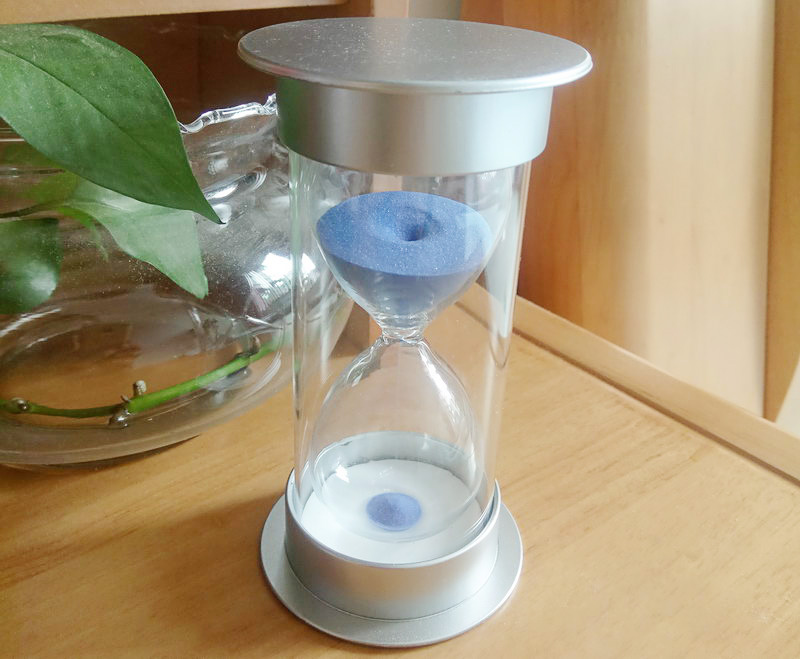 忘了在哪位网友博客中见到过一个沙漏,深深地被吸引着,惦念了良久,于是乎亦在网上淘得一个,以解心中喜爱之情。此沙漏计时为30分钟,银白色塑料胶座,外壳围裹着一圈透明亚克力,内嵌上下两个相互衔接的中空圆锥玻璃体,细小的蓝色沙粒穿过中间的小孔向下坠落,有趣极了。