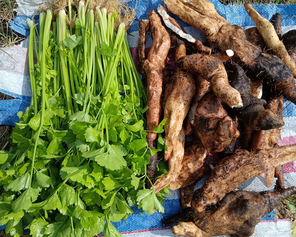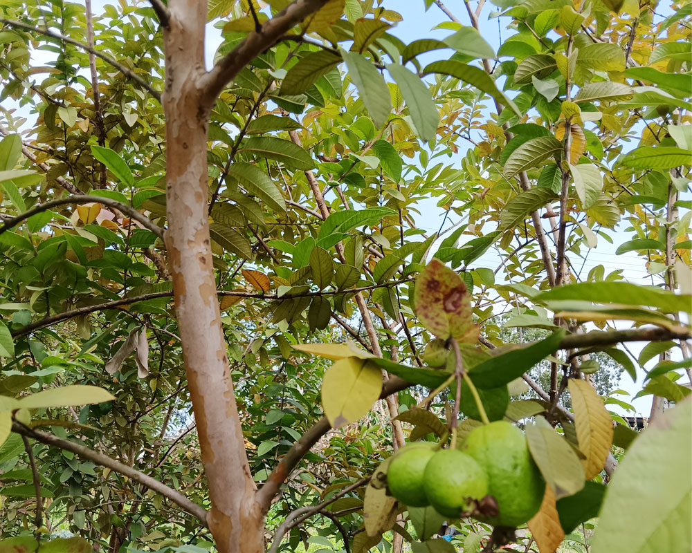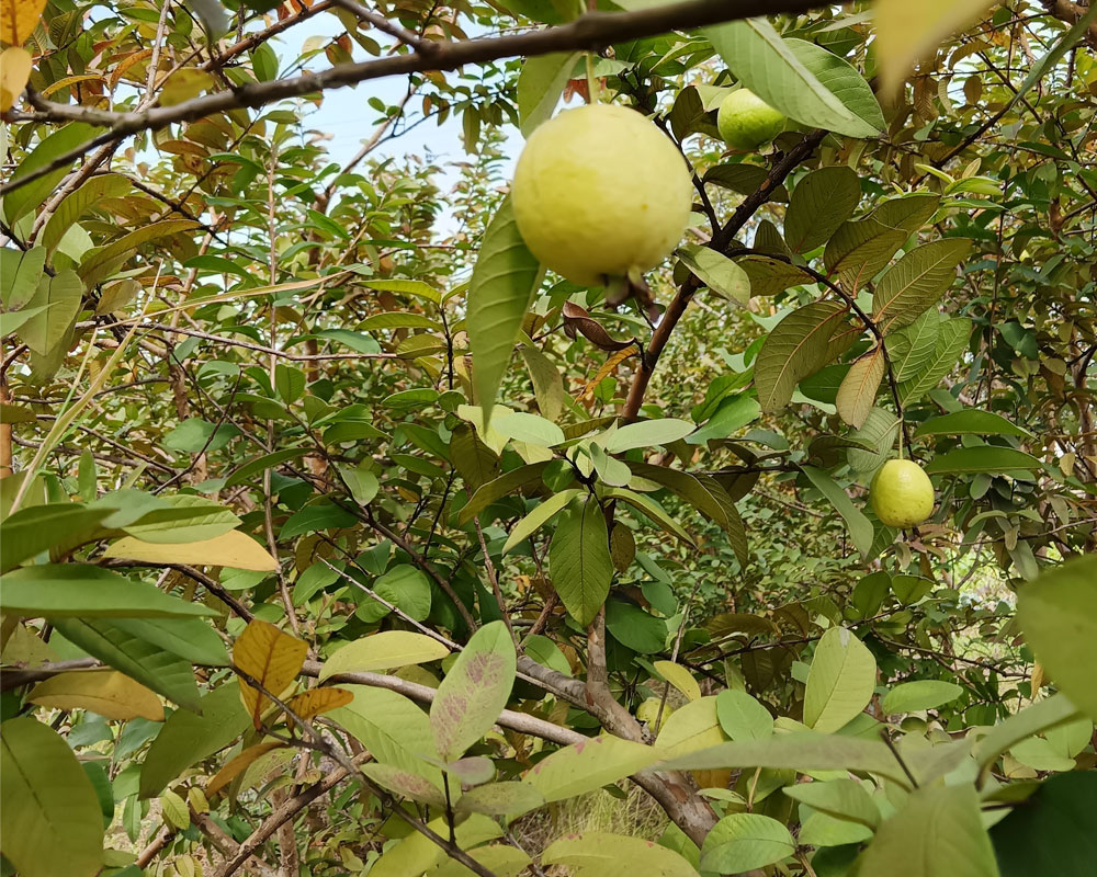 我把清洗好的菜摆放在草地上,直起早已酸软的腿,抬头看见池塘边几株野生的挂着青黄果子的果树,惊喜不已。妈妈说这些果子是可以吃的,我走近去瞧了瞧,原来就是小时候时常摘来吃的“鸡屎果”,脑海浮现散发着异香的脆甜的果肉,长大后才知道它有个别致的名字,叫番石榴。我拿起手机把这美好留下,它的存在让菜园子更富有生命力了。